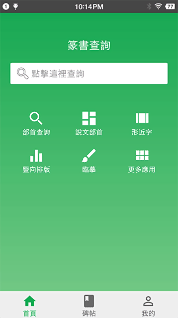 1、打开软件,首页不仅可以对篆书进行查询,还可以通过部首进行查询,在这里用户还可以对篆体字进行临摹,软件还为部分用户提供篆书口诀,让大家轻松学好篆体字;