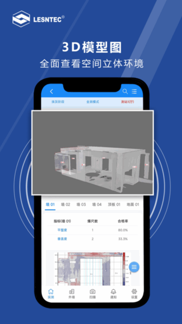 领盛实测实量app是一款面向建筑行业提供测录服务的应用工具,支持三维激光扫描,展现3d立体模型图,提供热力分析图,分析墙面情况,全方位查看了解,房间测量更加简单高效,一键计算,实时定量分析,生成报告,操作简单!
