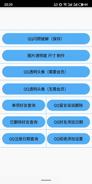 布偶必备工具这款手机应用小工具真的挺实用的,功能多而且操作简单。里面有很多小功能,比如QQ坦白说查询、已删除好友查询、全民K歌解析下载等等,满足日常需求完全没问题。最让我觉得方便的是它能一键制作透明头像,想换就换特别酷!还有免费租号和点亮超级QQ标志的功能,不用花钱就能解锁新玩法,真的很贴心。界面设计也很简洁,上手很容易,基本点进去选功能就行。对于喜欢折腾QQ或者需要一些小工具的人来说,这款软件绝对是个不错的选择。虽然说不上完美,但确实能解决不少问题,推荐试试!