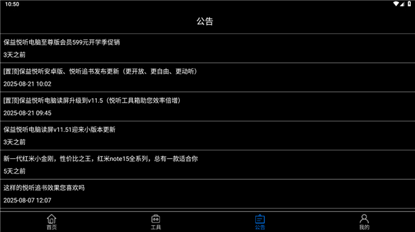 App还新增了一个开放性的工具聚合功能,用户可以把悦听阅读、悦听时钟、百度网盘保益版和音频转文本等功能集成到一起,使用起来更方便。此外,保益悦听还有个性化音频调节、智能听力评估、多功能集成等特点,能满足不同用户的多样化需求。