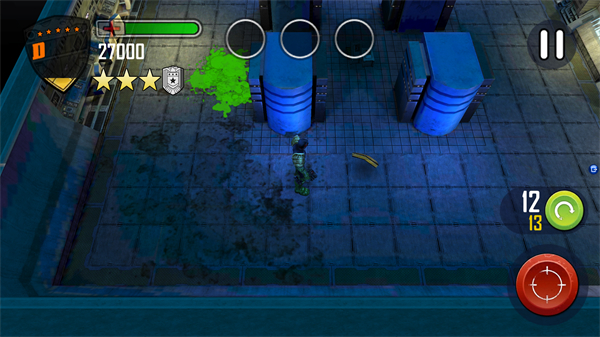 玩家根据自己的喜好选择完了武器,我们就要开始踏上拯救家园的慢慢旅途了,在此之前,笔者现为大家介绍一下如何操作吧。屏幕的左端有一个虚拟的摇杆,控制着主角的移动,右边则有两个按钮,红的是射击键,绿的是装填子弹用的,而玩家的血量则在屏幕的左上方可以看到。
