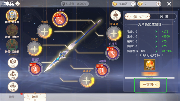 神灵神兵可镶嵌魂灵,集齐八件对应品级魂灵后可产生共鸣效果。对应的神兵只能镶嵌对应神兵的魂灵。