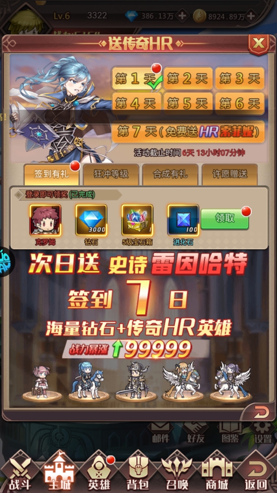 7、每日签到可领取丰厚奖励,连续签到7天更能收获海量钻石与传奇HR英雄,让你的冒险如虎添翼。