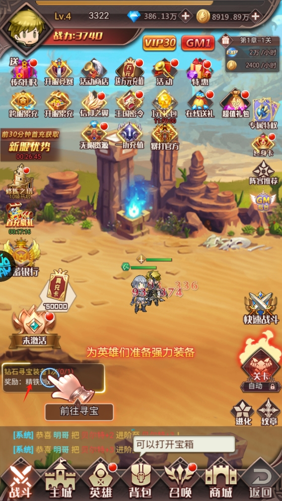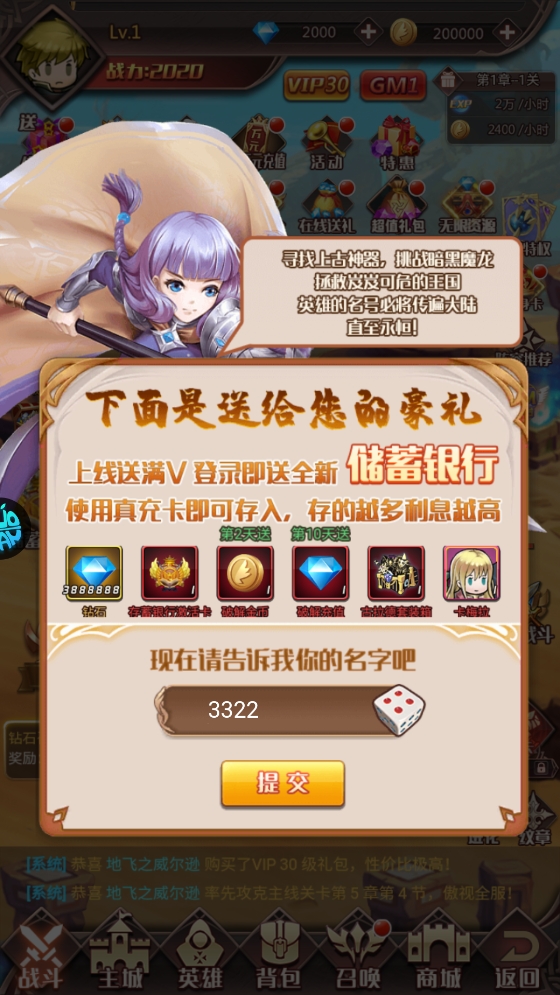 2、登录游戏即可领取钻石、金币以及储蓄银行激活卡,这些初始资源将为你的战斗提供有力支持。