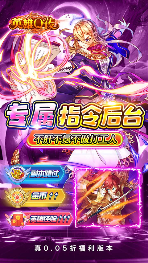 英雄Q传(0.05折送GM后台)是一款融合挂机与策略战棋的卡牌手游,玩家将化身勇士,游历火山、沙漠、海滩等风格迥异的奇幻场景,踏上守卫家园的征途、对抗威暗黑魔龙的征途。游戏中,玩家需要募集各种勇者,排兵布阵、策略搭配,并在推图闯关的过程中利用资源培养勇者队伍,以提升战斗力。此外,英雄Q传手游为了助力玩家快速养成,还内置创角即送0.1充值优惠福利及海量的道具资源!