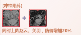 同时上阵赵云、关羽,防御增加20%。