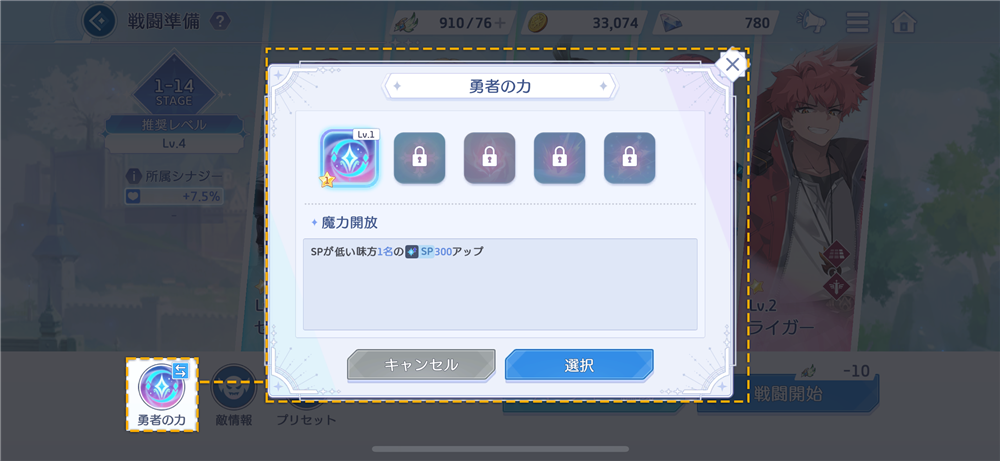 1)英雄等级:检查英雄的当前等级和基于等级的增强状态,并升级。