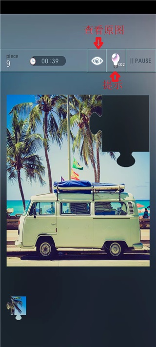 7、当然如果你无从下手时,还可以选择上方的灯泡进行提示,还可以点击上方的眼睛查看拼图的图片。