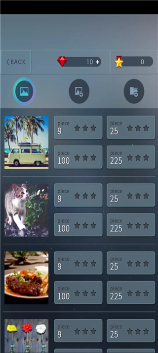 益智拼图世界(Jigsaw puzzle world)是由MOBIRIX厂商打造的一款休闲益智手游,游戏为大家内置多种类型的图片进行选择,有风景、动物、车辆、食物等类型,并提供4种不同难度的模式进行选择,其中分别是9件,25件,100件,225件,玩家们可以选择任意一种难度进行拼图。