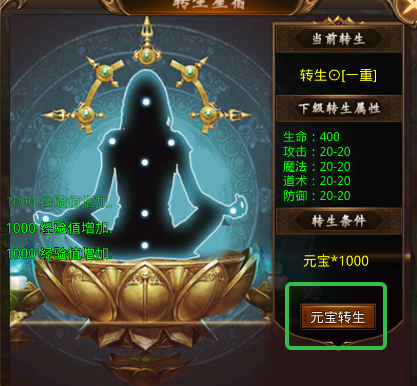 玩家可使用元宝进行转生,提升生命、攻击法术等属性。