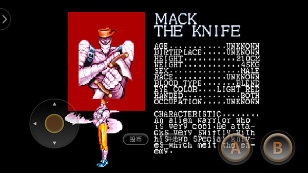 街机名将手机版是一款经典动作闯关手游,英文名为Captain Commando,又称“名将军团”、“刀手”、“刀客"。游戏最多能够支持4人同时联机玩,内置8个方向键功能的摇杆,两个功能键,玩法也很简单,开局玩家可以从MACK、BABY HEAD、Captain Commando以及GIUZU这四位主角中选择一位开始冒险,击败关卡内的敌人获取道具和经验来进行升级,由于不同的角色都有不同的连招和玩法,所以玩家可以根据自己的战斗风格进行选择,自由感受一场畅快的冒险体验!