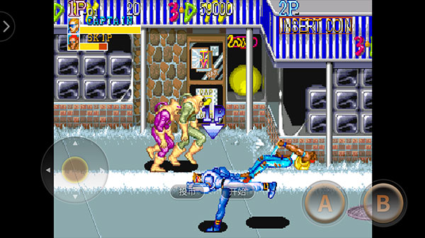 3、进入关卡,操控这名角色进行闯关,左边控制移动方向,右侧A键是出拳/抬起,B是跳跃。