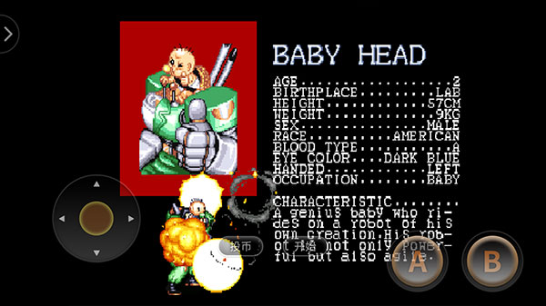 婴儿不具备攻击能力,他所驾驶的高智能机器可是力大无穷,所以攻击能力很高。不过由于婴儿是个左撇子(所以聪明嘛),拳头就显的最慢最短,而且腿脚不是很长,只适合近身攻击,不过由于考虑婴儿的安全,取消了倒空翻的招数,反而加入了符合婴儿顽皮特性的抓人大坐绝招,游戏设计的十分人性化,婴儿的综合能力是4人中最弱的。