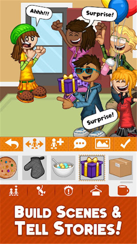 创建伙伴只是一个开始! 将你的朋友与风景、文字气泡和道具结合起来,安排你自己的自定义场景。 您可以将好友放置在场景中您喜欢的任何位置,并使用手势旋转和调整它们的大小。 从每个角色的各种姿势中进行选择,并改变他们的面部表情以匹配他们的心情。 您可以在场景中使用各种背景来帮助讲述您的故事,还有数十种道具可供您的朋友握在手中。 如果朋友有话要说,还可以在场景中添加单词气泡和标题!