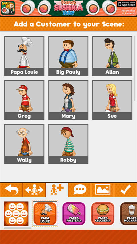 您的朋友正在寻找更多朋友吗? 您还可以包括 Papa Louie 和他来自他的许多餐厅(如 Papa's Freezeria)的著名顾客! 提供多个客户包,其中包括少数客户、大量场景的新背景和道具,以及任何自定义伙伴都可以使用的新服装。 顾客可以使用与您的朋友相同的所有姿势和道具,他们甚至会配备自己独特的替代服装。