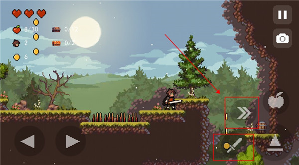 5、左边两个按键是左右移动,右边的则是跳跃键,双击可以二段跳,可以用来躲避敌人攻击和翻越障碍物