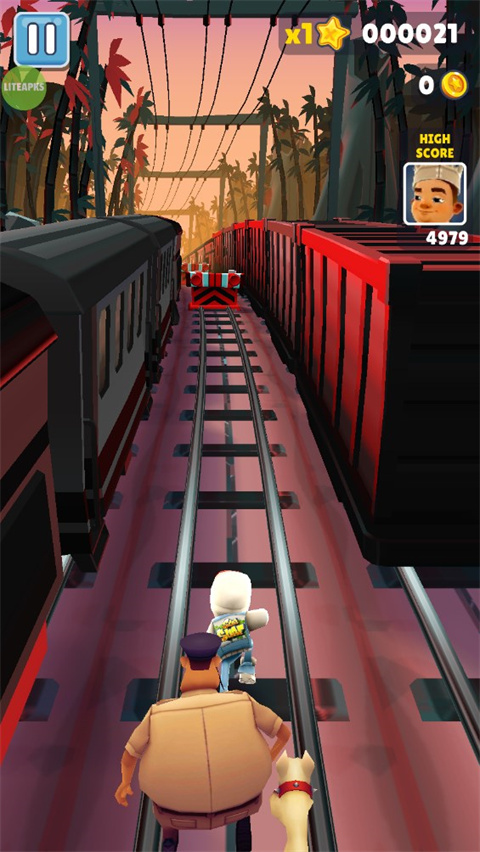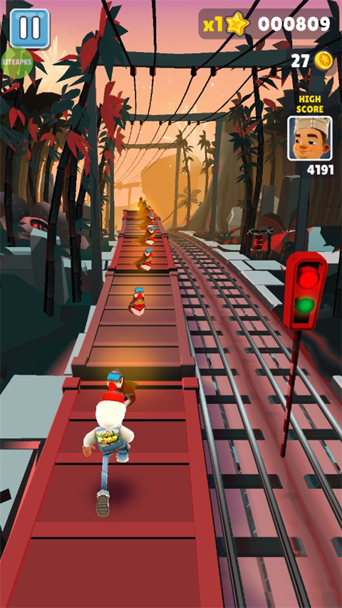 目标是尽可能跑的远,同时还要尽可能多的收集铁轨上的金币,游戏的视角是面向角色前进的方向。