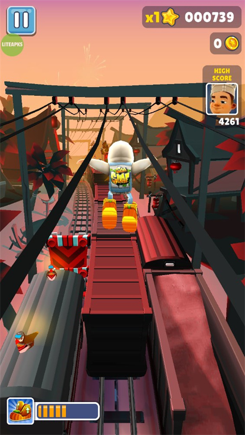 滑板:通过双击屏幕来启动滑板,滑板会持续一段时间。在没有滑板的情况下,角色撞到火车或者障碍等都会被抓住,导致游戏结束。但在有滑板的状态下,角色就有了一道保险,撞到火车等的时候,滑板会消失,游戏可以继续进行。
