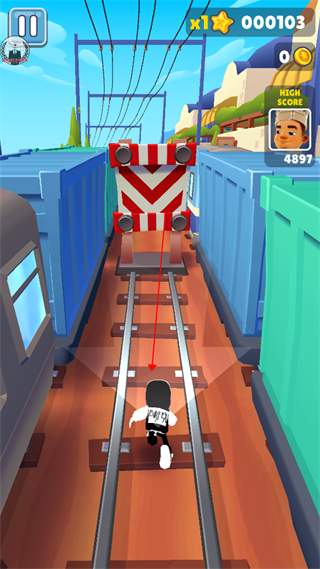5、通过双击屏幕来启动滑板,滑板会持续一段时间。在没有滑板的情况下,角色撞到火车或者障碍等都会被抓住,游戏终结。但在有滑板的状态下,角色就有了一道保险,撞到火车等的时候,滑板会消失,游戏可以继续进行。