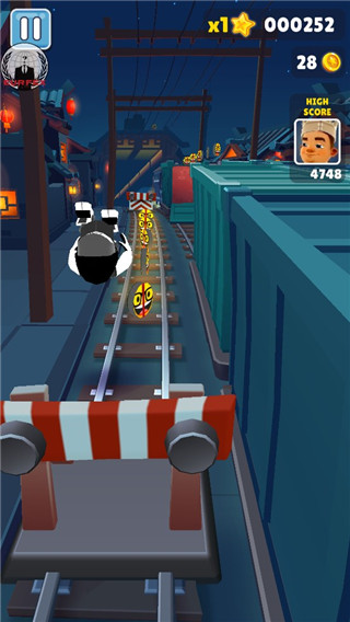 4、玩家快要跑到柱子的时候,会突然出现一辆列车。玩家这个时候往右边撞一下,然后快速回来,落下的位置正好在柱子前,这个时候发现我们的角色会不停的无限的跑,而我们的分数也在不停的涨。