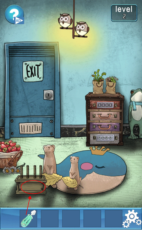 1、点击如图所示位置小动物手里面的螺丝刀。之后使用螺丝刀将左下角的柜子打开。