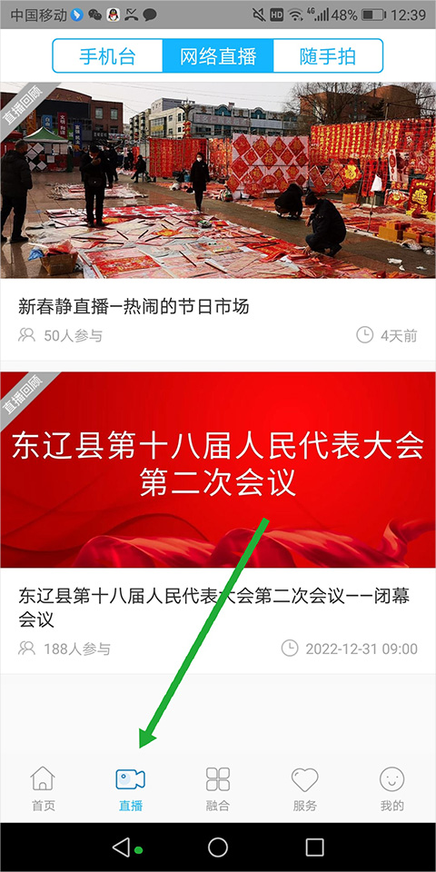 1、用户打开e东辽app后,切换底部导航栏至【直播】处(下图绿色箭头所指区)