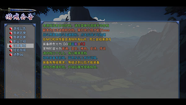 4、本游戏是刷子游戏,那些总想着可以挂所有怪的玩家,挂机战斗后直接恢复的玩家,在这里说声抱歉,这个游戏不是挂机游戏,只是游戏有挂机,我在尽量不损害游戏初衷的情况下,已经尽量改了一部分设定,以后不会在boss挂机,战斗恢复上修改了;