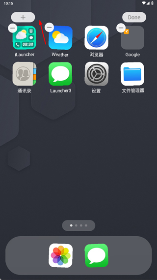 1、打开iLauncher最新版,设置完主题后返回手机桌面,接着长按手机屏幕,点击左上角+号;