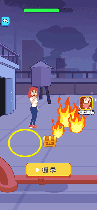 2、来到楼顶,先别急着把火扑灭,先把圆圈内的箱子擦除,又找到一隐藏物品;