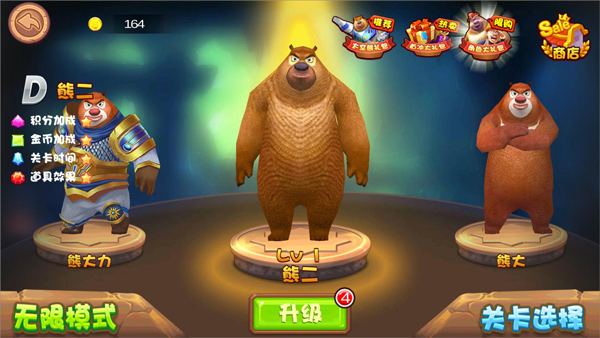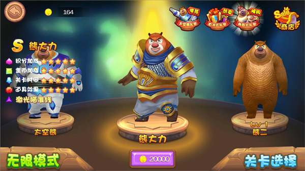1、打开熊出没之熊大夺宝游戏,进入游戏主页面,玩家可以选择不同的角色进行探索冒险,有熊大、熊二、光头强、矿工强、熊大力的等,玩家还可切换无限模式进行闯关;