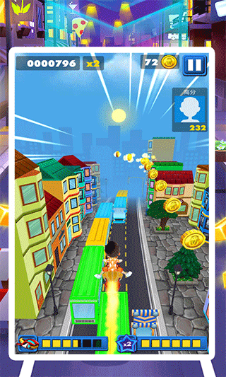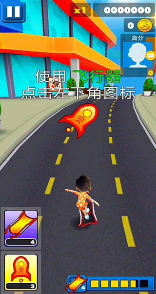 3、点击左下角的图标按钮,也可以使用飞行器和滑板道具,及时使用还能救你一命哦,也可以利用它们跑的更远,刷新自己的最高记录;