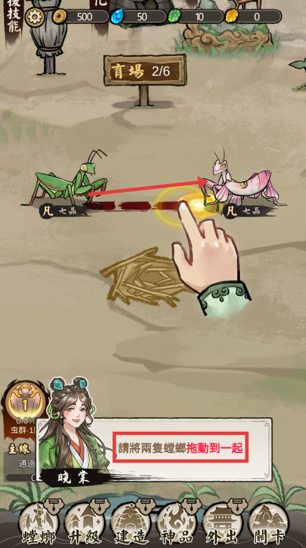 2、在育场场景中,按照提示将两只螳螂拖动到一起,以此触发繁殖相关的养成操作。