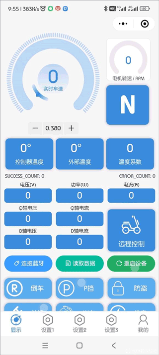 连接成功后,App主界面会实时显示设备关键参数(如电压、电流、温度、转速等)。用户可通过滑动屏幕或点击选项卡切换不同参数视图,并直接调整电机转速、弱磁值、电流保护等核心参数。