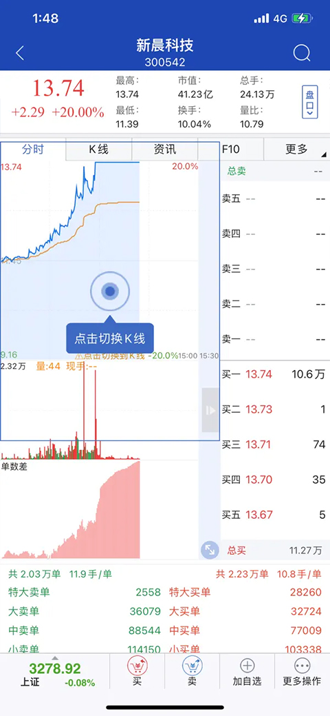 3、闪电交易,可用在个股分时页快捷下单,节省超过30%的下单时间,交易快人一步。