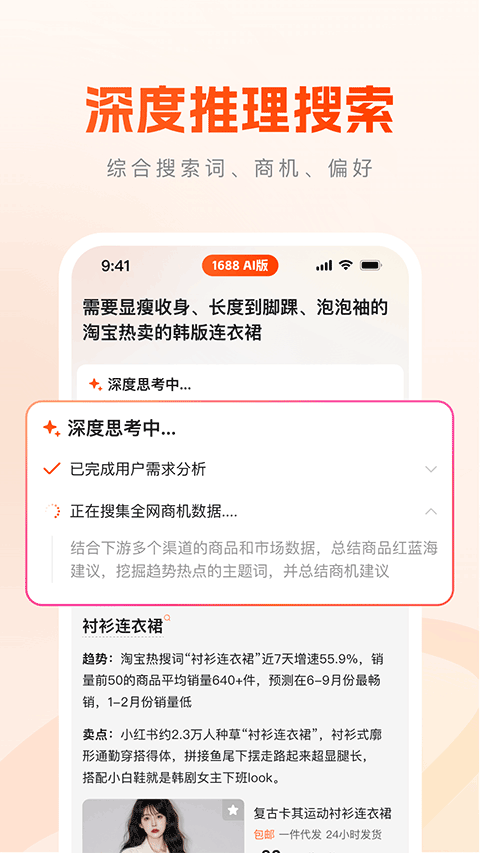 1688AI版app阿里巴巴旗下1688平台推出的智能化采购批发应用,专为中小企业及个体商户打造,以AI技术为核心驱动,重构传统B2B交易流程。该应用深度整合供应链资源,覆盖工业品、原材料、日用百货等全品类商品,通过智能选品、精准比价、趋势预测三大功能,帮助用户快速匹配优质货源,降低采购成本。