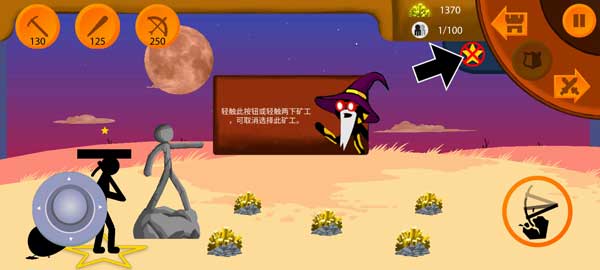 3、第一步就是训练矿工,这样就能获得源源不断的黄金了,黄金可以用来雇佣更多的矿工、棍棒手、弓箭手。