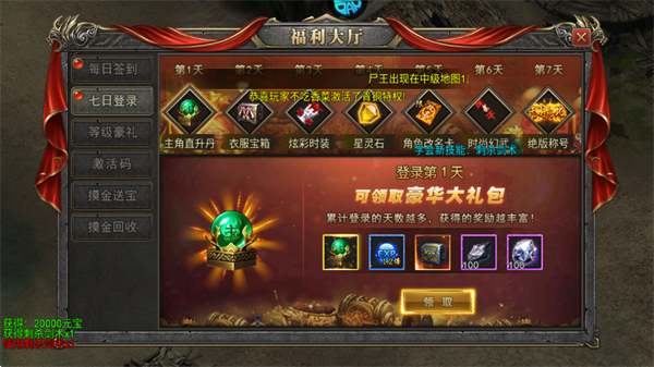 4、每日登录可领取豪华大礼包,累计登录的天数越多,获得的奖励越丰富!