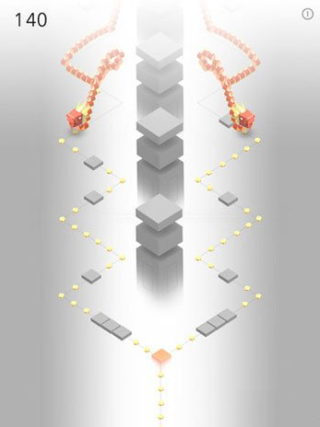 游戏中有丰富的角色可供解锁,每个角色都有独特的场景设置,场景是程序生成的,多达100个等级,每个等级都不同。在Game Center里还能和朋友 PK 比较分数。游戏还提供了一个空间传送点,会让小方块分裂成很多碎块分散到两条路上,这时候是最考验手速和耐心的时候。