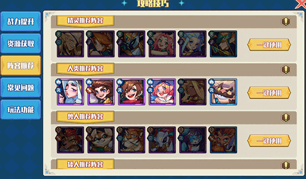 3、这里就可以看见系统推荐的阵容了,还可以一键上阵非常方便