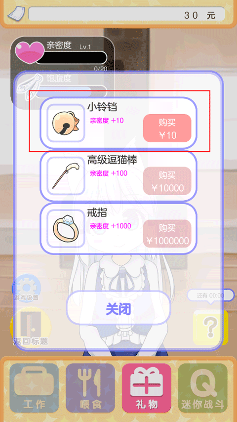 游戏里有两大数据:饱腹度和亲密度。饱腹度会慢慢减少,饿到0的话亲密度也会掉,得及时喂食。食物的价格固定,但后面的食物还能提升饱腹上限,这样就不用频繁喂食了。送礼物是提升亲密度的主要方式,简单暴力,直接给大额礼物就能快速拉高亲密度。