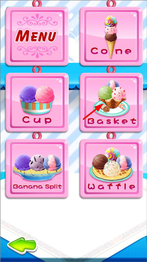 5、等冰淇淋冻好了,选择一个玩家喜欢的造型,然后将冰淇淋球拖到闪动的圆圈里,玩家可以组合不同的口味,让它更独特;