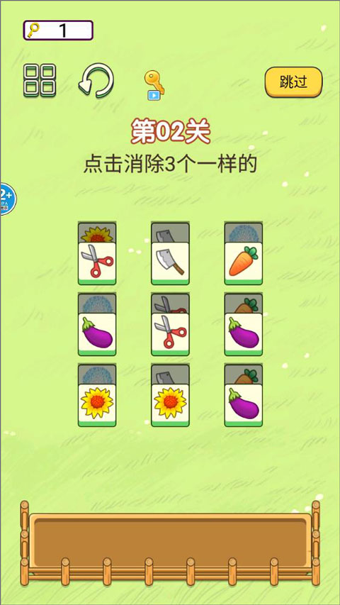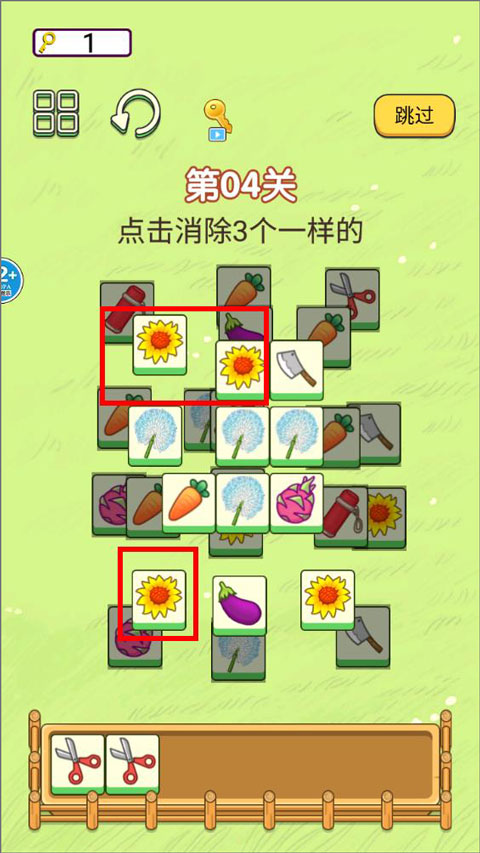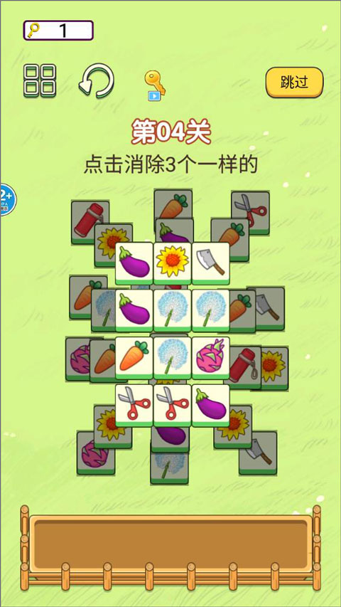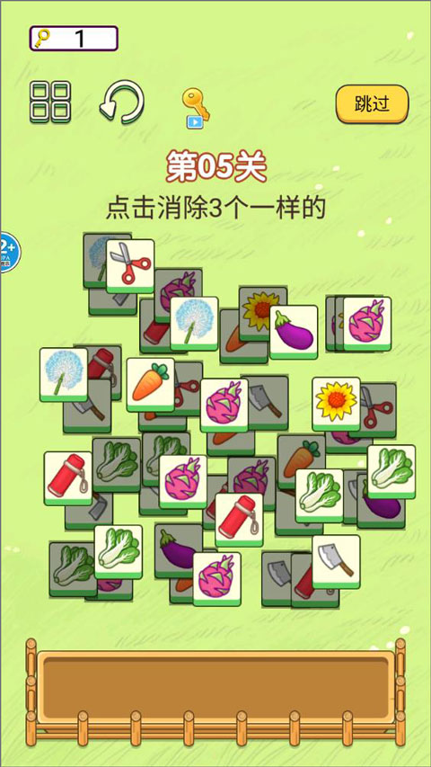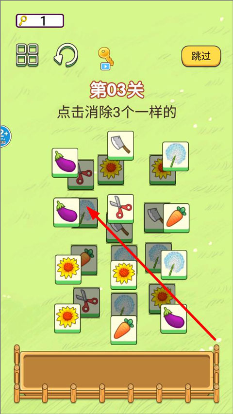 2、进入第三关页面,玩家需要消除相同图案的方块,首先是茄子、向日葵、胡萝卜等;