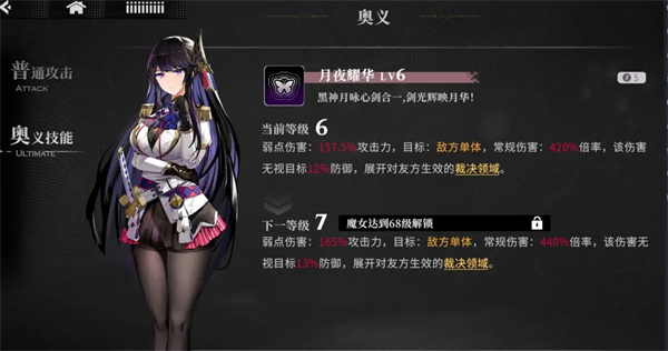 奥义技能(1级):目标,敌方单体;展开领域,领域效果:攻击提升5%。无视目标7%防御