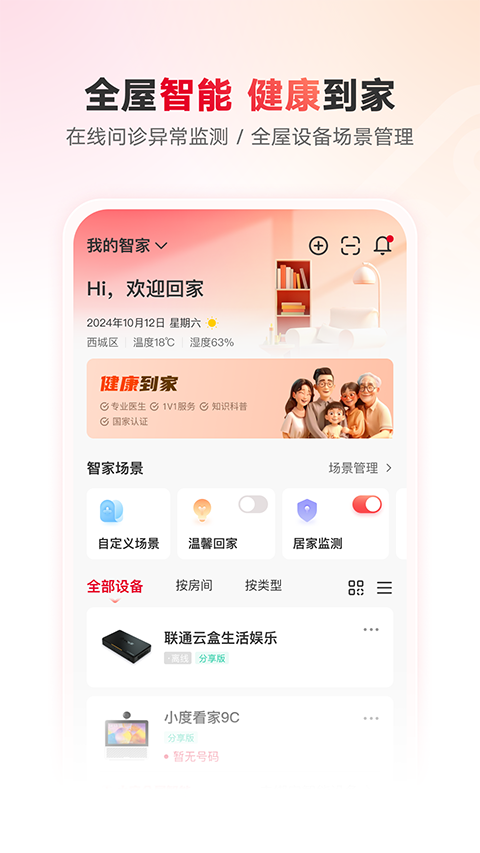 联通智家app官方版是一款由联通在线信息科技有限公司推出的智能家居软件,这款软件主要是以智慧家庭用户为中心,能够帮助用户管理家用wif,并且可以通过手机远程控制家中的WIFI、宽带,路由器还有机顶盒等设备,非常的智能化,让用户不管在哪里都能够随时随地查看家中的情况,同时还可以设置上网时间,支持远程控制和管理,轻松管理网关,拉黑蹭网设备,网络加速等功能,非常的实用。联通智家APP主要的功能是为了让用户享受到科技带来的智能化生活,并且联通智家最新版本当中还融合了智能家居控制连接、家庭网络控制、家庭娱乐、业务办理等多场景,是家庭生活的智慧助手和家庭业务的统一入口,为用户打造不一样的智慧家庭,提供智慧生活的整体解决方案。