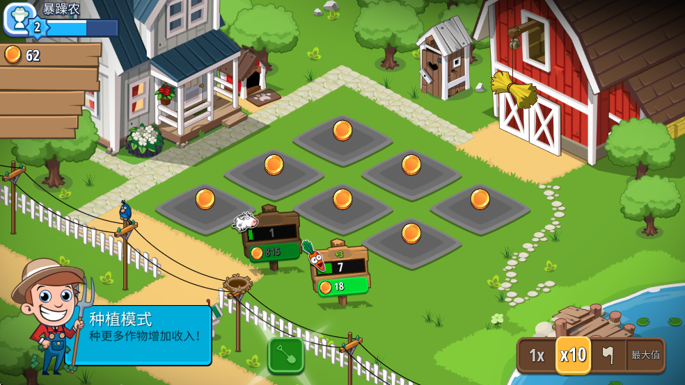 闲置农业帝国(Idle Farming Empire)是一款模拟经营类游戏,提供丰富的种植作物、种子类型、畜牧业动物,玩家需通关管理挂机期间的收益,自动化建设农场帝国!同时,你可以解锁更多的农作物以及动物来增加自己的产出和收益;也可以增加现有种植、养殖基地的数量来扩张自己的资金产业;还可以体验种植蔬菜,饲养动物的欢乐气氛,自动化经营史上最赚钱的农场帝国,让它发展壮大!喜欢农场模拟种植的用户一定不要错过。