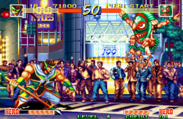 《世界英雄手机版》是一款由SNK推出的经典街机格斗游戏,玩家可以通过秘籍选用最终BOSS和孙悟空,也可以随机面对隐藏BOSS。游戏中有三种超必杀技:英雄必杀技、疯狂杀敌绝招和MAX疯狂杀敌绝招,残血或全满英雄槽时可以触发这些技能来快速击败对手。
