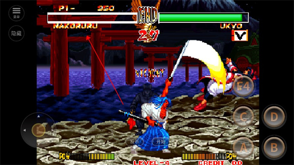 游戏《侍魂2》的玩法也跟游戏机上一模一样,在游戏左下角玩家通过操作摇杆来控制人物动作,右下角设置有4个按键,分别控制拳,脚,放宝和暴气。简洁的按键操作可以让玩家在游戏中更加直接方便地体验到格斗的乐趣。