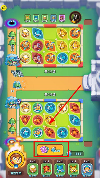 1、打开进入后选择想挑战的模式,进入战场后如下所示:点击屏幕红色框框,消耗、解锁不同等级进行对战,而且相同等级的还可通过合成,解锁更高等级的角色哦