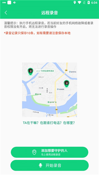 1、下载进入守护亲友app,你可以通过远程录音功能,时刻掌握亲友周边环境情况,保护TA的安全;