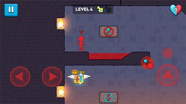 • 通过箭头移动红棒和蓝棒并避开障碍物。红棒必须避水,蓝棒必须避火。